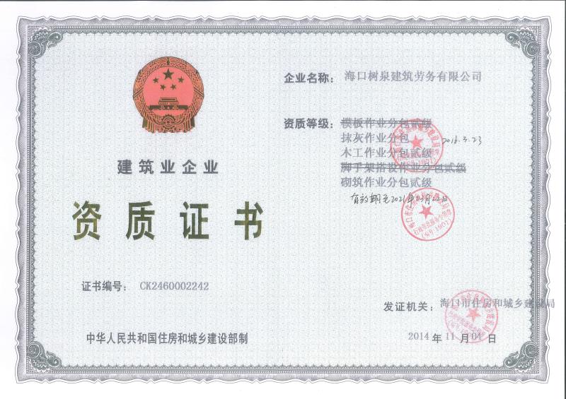 海口樹泉建筑勞務(wù)有限公司成立于2011年,公司位于海口,其前身是一家專業(yè)建筑施工隊(duì),自2004年即開始在海南從事建筑勞務(wù)施工。自成立至今,公司已經(jīng)擁有一支科學(xué)管理、質(zhì)量過硬、能打硬仗,搶工期的專業(yè)隊(duì)伍。能獨(dú)立承擔(dān)大中型工業(yè)與民用建筑 、室內(nèi)外裝修、各類機(jī)電設(shè)備安裝工程。代表工程有海口濱海華庭、三亞時(shí)代海岸T01/02/04/05棟高層、合肥東海花園二期、陵水富力灣B區(qū)高層、三亞金中海(酒店)、瓊海大印經(jīng)典花園、海口環(huán)球海景大酒店(四星級(jí)酒店,在建中)、陵水珍珠大廈(五星酒店)、海口萬(wàn)達(dá)廣場(chǎng)、美蘭機(jī)場(chǎng)二期。